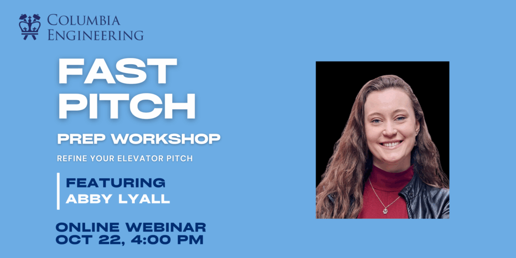 Join the virtual Fast Pitch preparation workshop with Abby Lyall to craft a 60-second pitch for Columbia Engineering’s annual Fast Pitch competition. If you are a startup founder preparing for Fast Pitch, or just want to learn more about pitching, sign up for the online workshop.